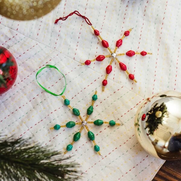 Bring timeless beauty to your holiday d??cor with the Beaded Snowflake Ornament Set ?C Red & Green. Each ornament is handcrafted with stainless steel wire and adorned with handmade paper beads??carefully cut. rolled. and varnished for long-lasting durability. The set includes two snowflakes. one in festive red and one in vibrant green. creating a simple yet striking accent for your Christmas tree. Finished with repurposed leather scraps and cotton strings. these ornaments are as sustainable as they are beautiful. making them a meaningful addition to your collection year after year.