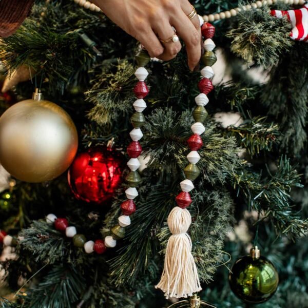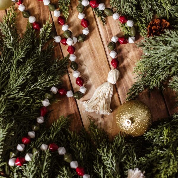 Add color and character to your holiday d??cor with the Chunky Paper Bead Christmas Garland. Handcrafted from recycled newspaper. this eco-friendly garland features chunky red. white. and green paper beads strung together on twine. with playful tassels at each end. Finished with paint and shellac for durability. it’s lightweight. festive. and perfect for draping across your tree. mantle. or doorway. A sustainable decoration that combines creativity with tradition. this garland is designed to bring joy year after year.