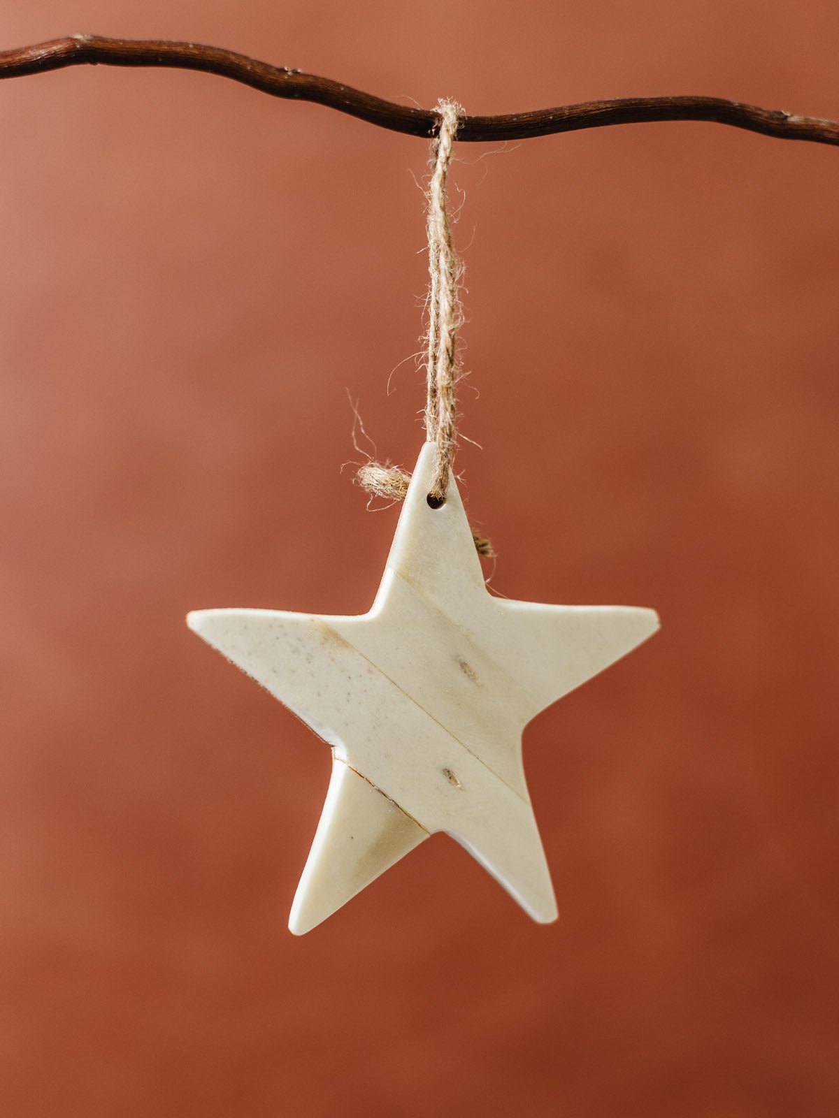 The Handmade Bone and Wood Ornament Set gives these ornament classics a sophisticated and natural look. Crafted by skilled artisans using recycled cow bone and wood. each ornament is finished with a twine hanger for easy display. This three-piece set includes a star. heart. and angel??each combining rustic texture with a refined. minimalist design. Beautifully balanced in style and sustainability. these ornaments add a timeless and organic touch to your Christmas tree or seasonal d??cor.