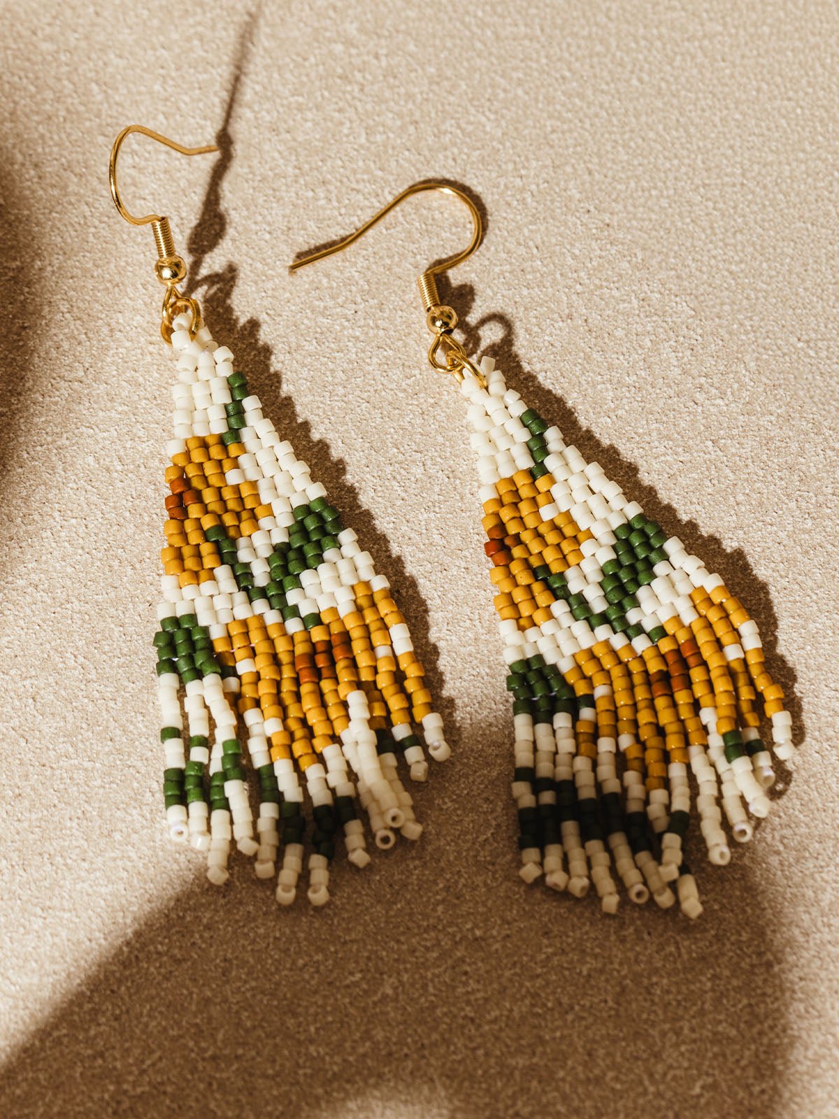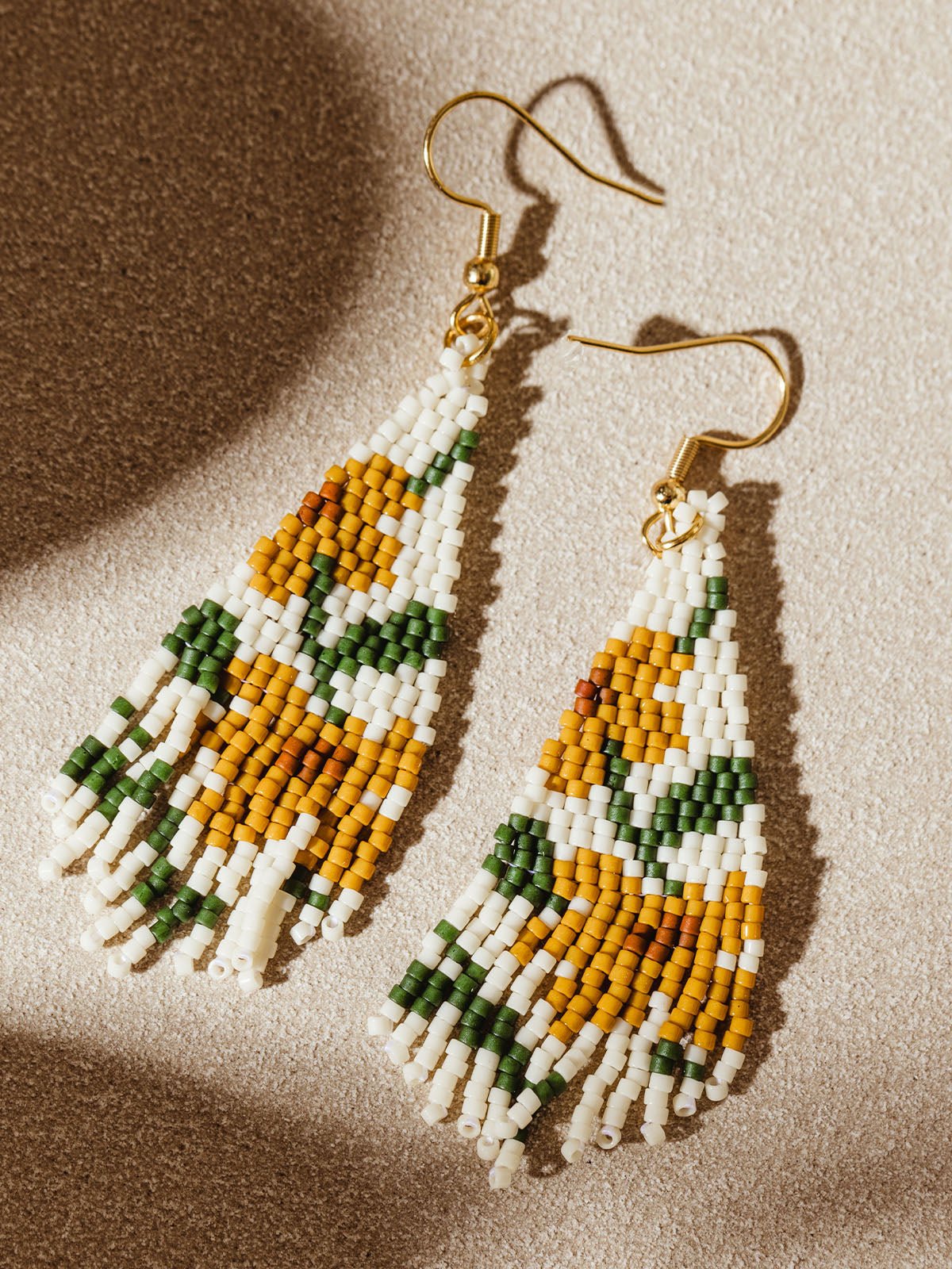 The Jardin Botanico Beaded Fringe Earrings are handmade and stunningly crafted with cream. green. and mustard yellow Miyuki glass beads on stainless steel hardware. The detailed beadwork features a floral motif. These beautiful bestsellers bring vibrant color to any outfit and also support artisans through fair wages.