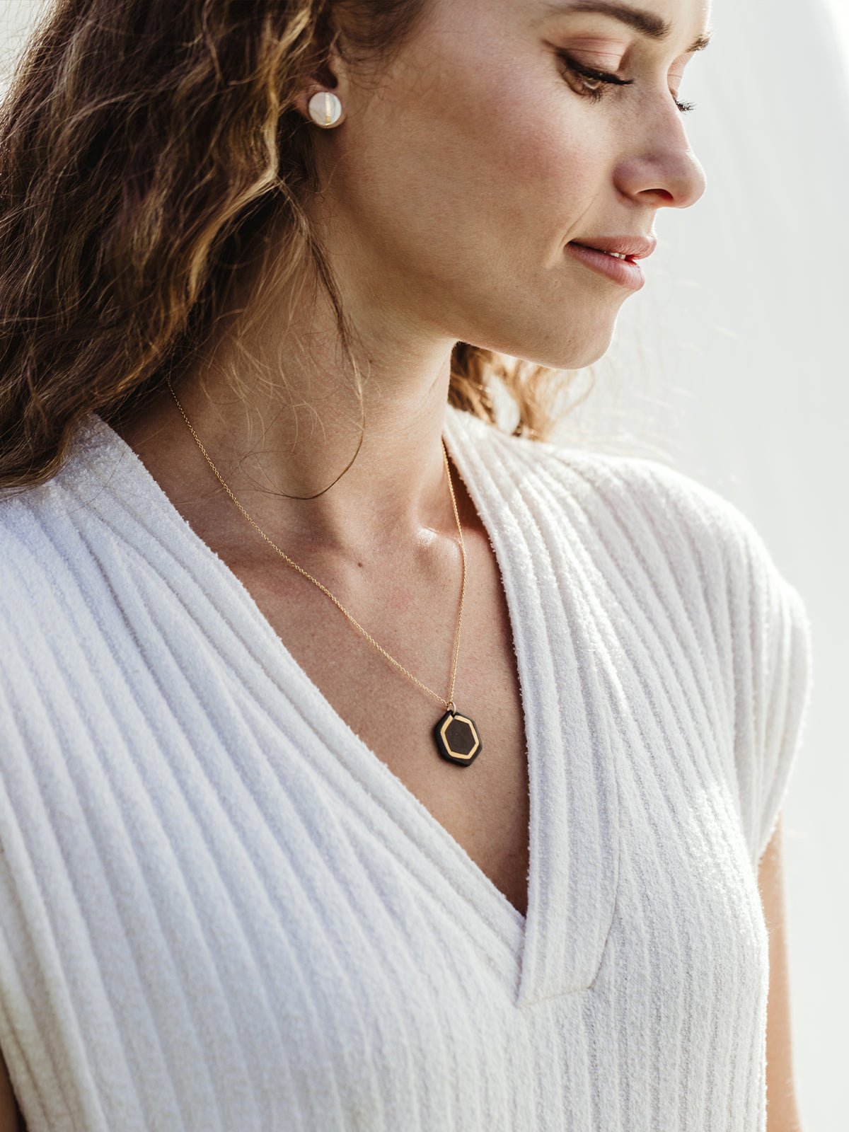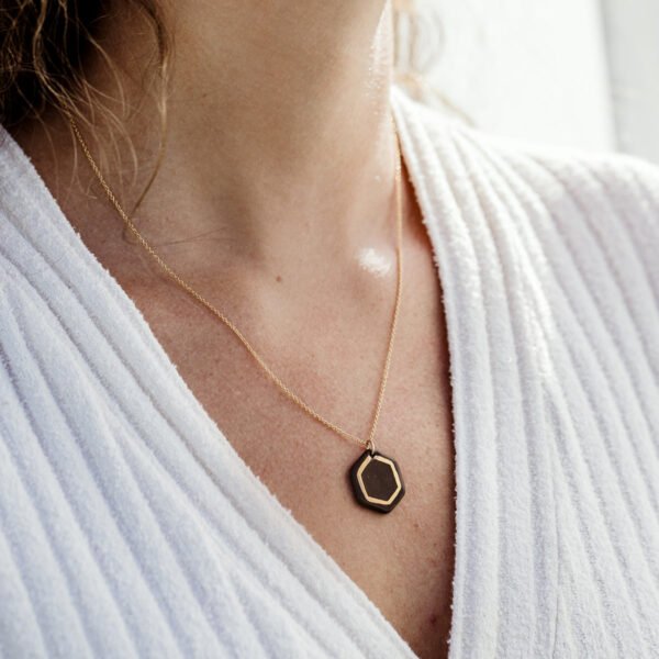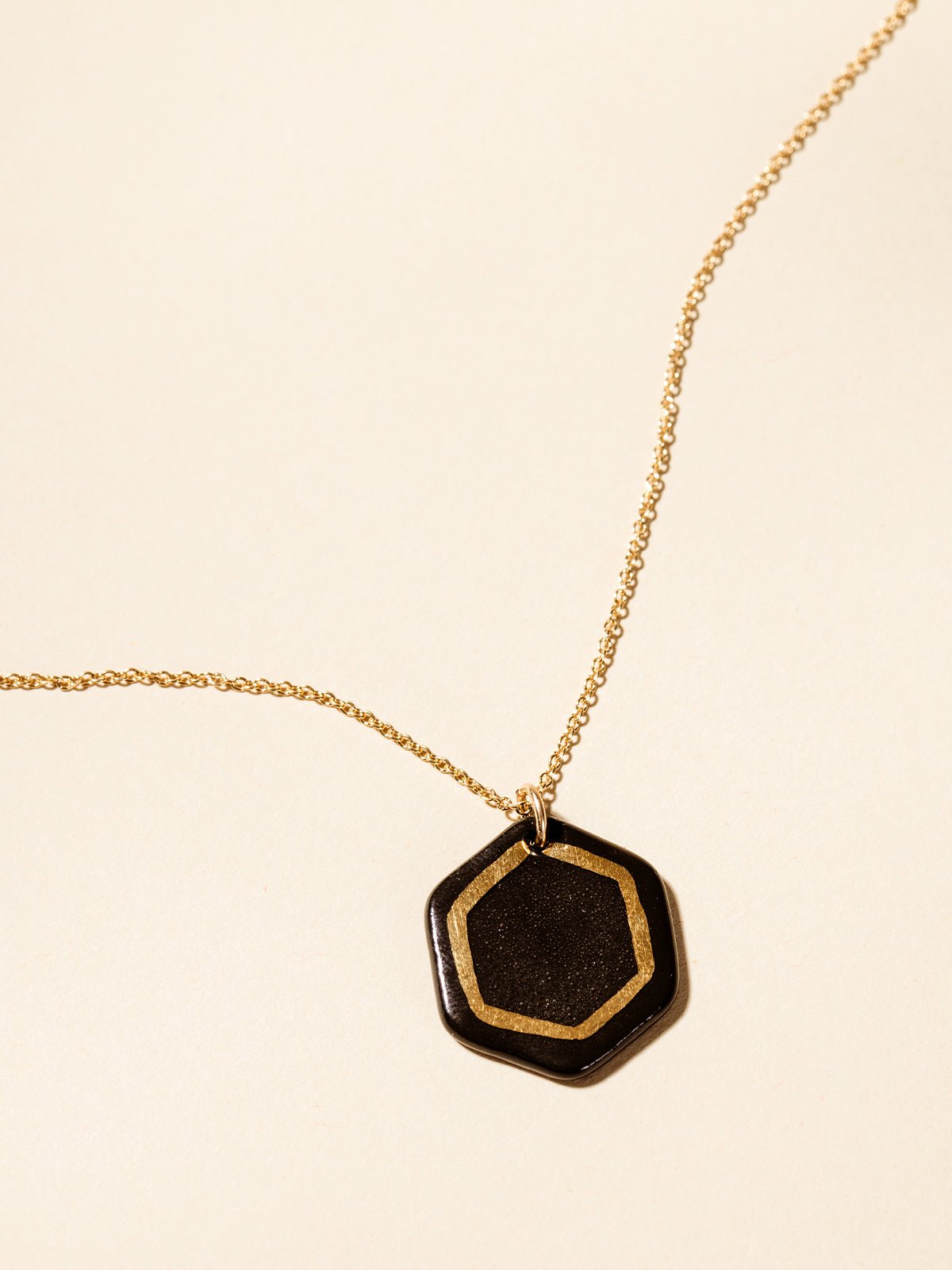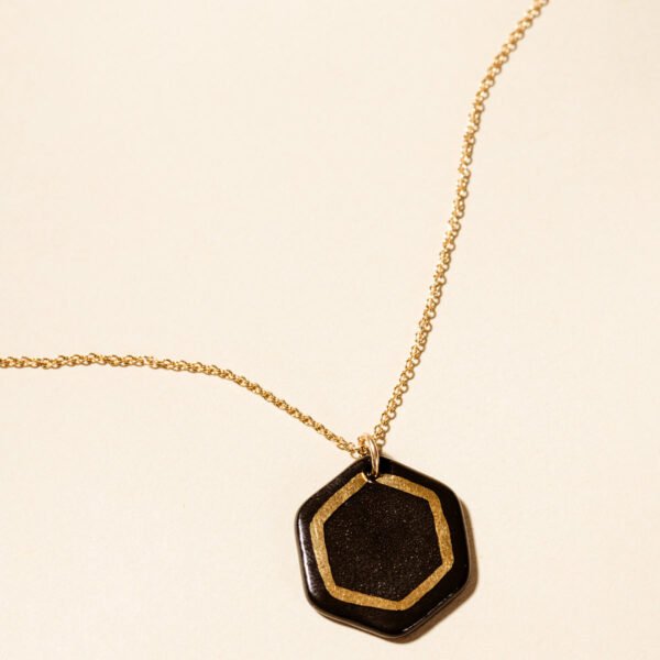 Joffa loves shiny jewelry staples that you can reach for again and again. and the Robin Hexagon Necklace from Sojourn Studio fits the bill! This delicate. hand-painted charm is made from porcelain and features gold luster detailing. Layer this gold necklace and pendant with other favorites or wear along for a standout accessory.